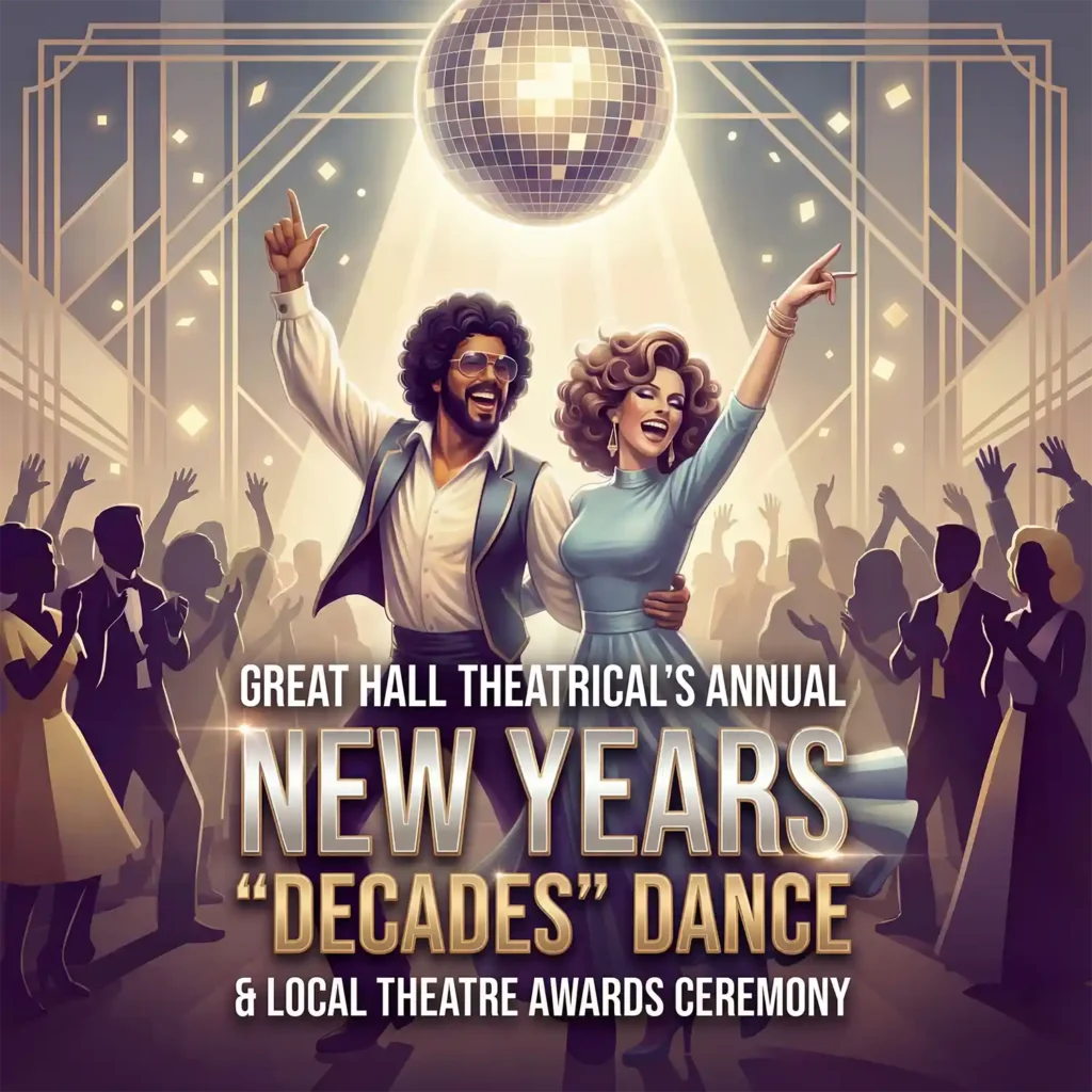 Great Hall’s fifth annual New Years celebration, dance, and local theatre awards ceremony (open to all), featuring 100 years of great music for dancing.