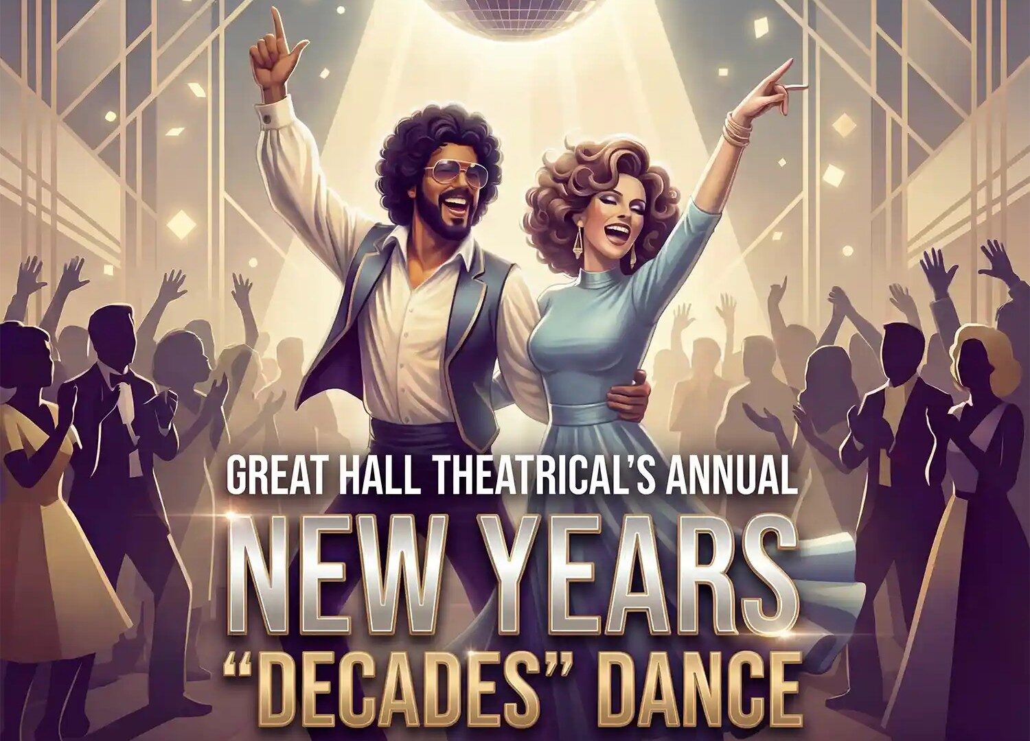 Great Hall's fifth annual New Years celebration, dance, and local theatre awards ceremony (open to all), featuring 100 years of great music for dancing. Come dressed from your favorite decade, formal, or in costume.